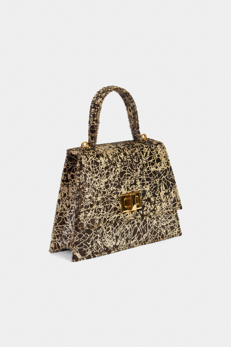 Découvrez le sac à main « Artemis mini », une pièce d’exception où l’artisanat belge rencontre la noblesse des matières. Conçu avec un cuir de poulain au toucher soyeux, ce sac se distingue par un motif abstrait unique, évoquant une texture craquelée et sophistiquée. Sa poignée et son fermoir géométrique en laiton doré soulignent son caractère fort et son allure résolument moderne.