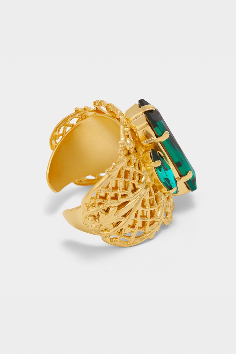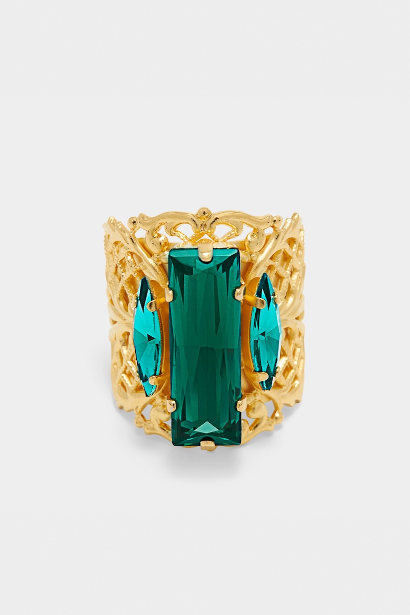 Bague ajustable en laiton doré et cristaux verts. Éblouissante et raffinée, cette bague ajustable en laiton plaqué or séduit par son design sculptural et son éclat unique. Son motif ajouré délicatement travaillé met en valeur une composition de cristaux couleur verts, taillés pour capter la lumière sous tous les angles. Avec sa hauteur de 3 cm, elle habille la main d’une touche d’élégance audacieuse, parfaite pour sublimer une tenue de soirée ou ajouter une note précieuse à un look du quotidien.