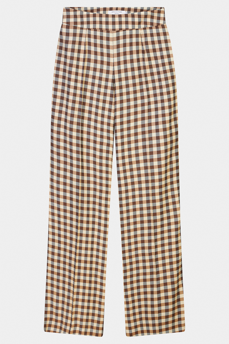 Pantalon à carreaux en viscose soyeuse, chic et confortable qui allie style graphique et douceur raffinée.